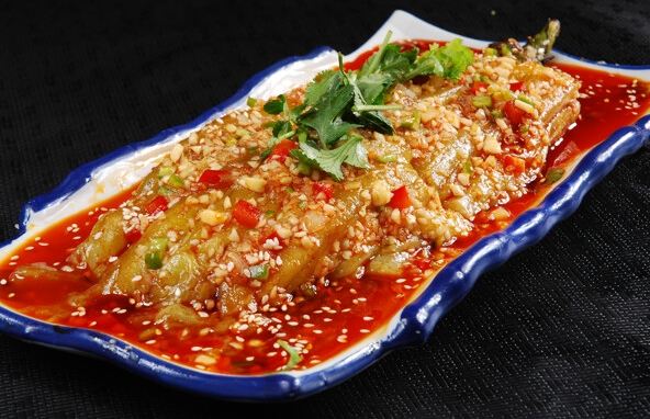 5. 淋醬爆香: 把調好的醬汁均勻淋在茄子條上。接著把蒜泥、蔥花、辣椒圈(如果用)集中堆在茄子最上方。重點來了! 燒熱約1.5大匙的食用油(沙拉油或耐高溫的植物油都可以),看到油微微冒煙時,快速淋在蒜泥蔥花上!聽到那「滋啦~」一聲,香氣瞬間爆炸開來!這就是美味的魔法時刻!