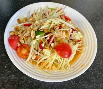 - 青木瓜沙拉 (ส้มตำ, Som Tam): 清爽開胃的必點涼拌菜。可以選辣度(建議從微辣開始),還有加鹹蛋、小螃蟹等不同版本。現點現搗,聲音清脆!