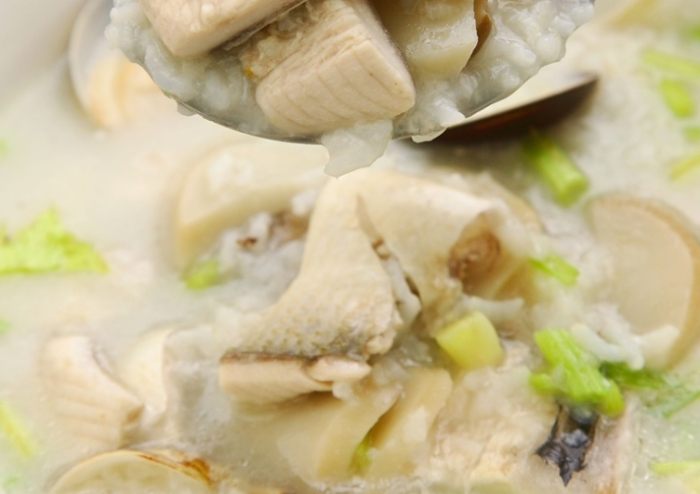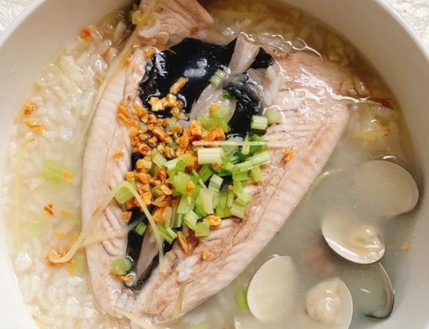 - 沖粥: 將滾燙的粥湯 均勻淋在魚肚上(熱湯能再次燙熟魚肚表面並鎖住鮮味)。