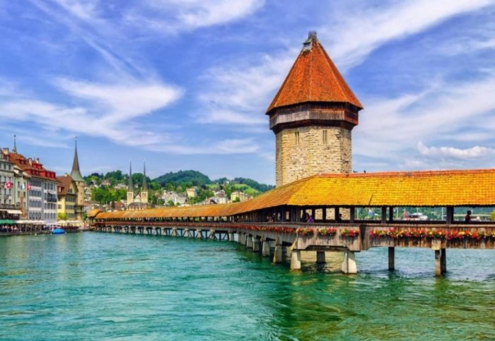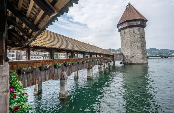 A: 好訊息,走這座橋完全免費! 它是公共的步行橋,24小時開放。橋內三角形木樑上的畫是17世紀創作(部分重建複製),內容是講琉森的歷史故事和守護聖人傳說,可以看作是中世紀的“連環畫”教科書,很有歷史價值。旁邊一般有簡短的多語言說明牌。