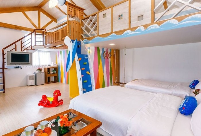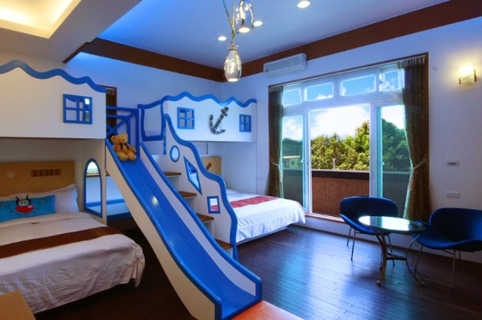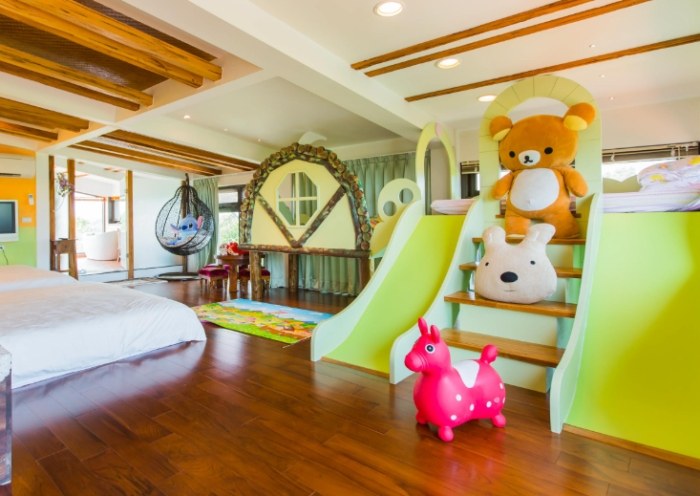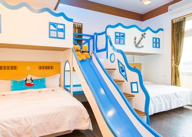- ※兒童遊樂設施: 室內外都精彩! 室內有大型球池溜滑梯組(不同主題房樓層有不同設施)、家家酒區、軌道車、繪本。戶外有小沙坑、戲水池(夏季)、草坪、鞦韆。