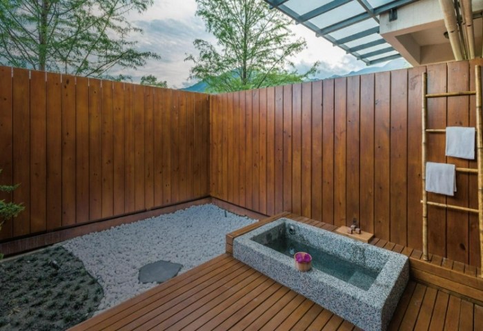 - 酒店介紹: 這家比較特別,位於瑞穗溫泉區,但感覺更偏向精緻的溫泉民宿。規模不大,環境小巧溫馨。最大特色是戶戶有半露天景觀溫泉湯池!每間房都有自己的泡湯空間,雖然不是檜木桶,但也是石材砌成,空間足夠,且有綠意造景。風格簡約舒適。